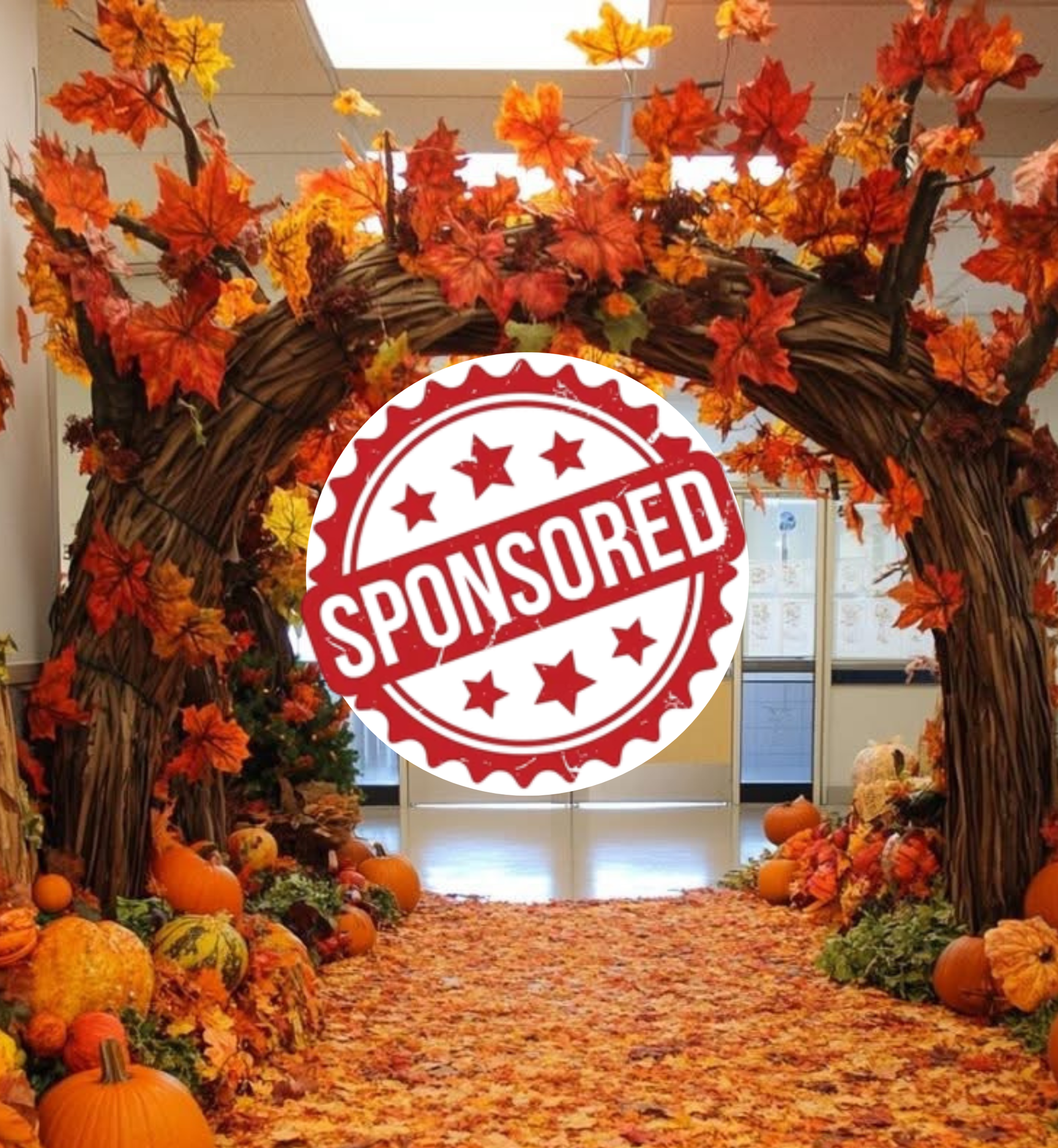 Your sponsor sign displayed at the base of the arch, surrounded by pumpkins and haybales